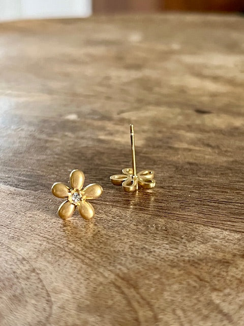 Boucles d'oreilles dorée en forme de fleur; ornée d'un brillant au centre.