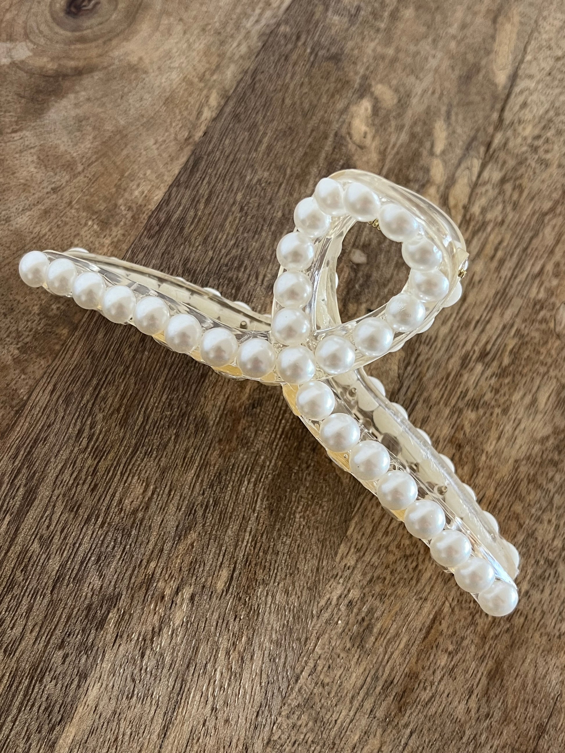 Pince à cheveux ornée de petites perles blanches nacrées.