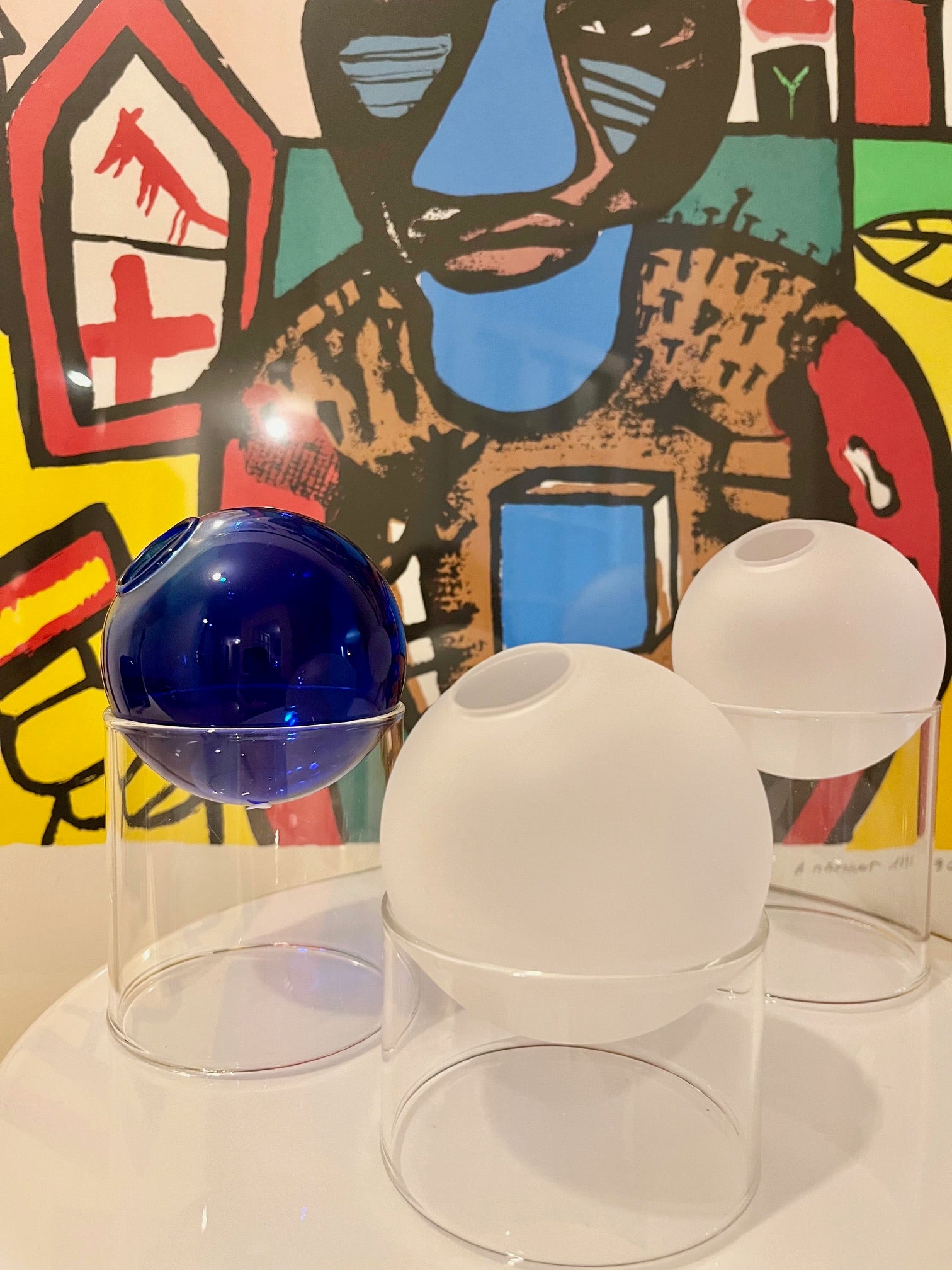 Grand vase bleu/blanc : 14.5cm de hauteur et 8cm de diamètre.